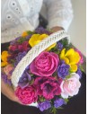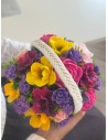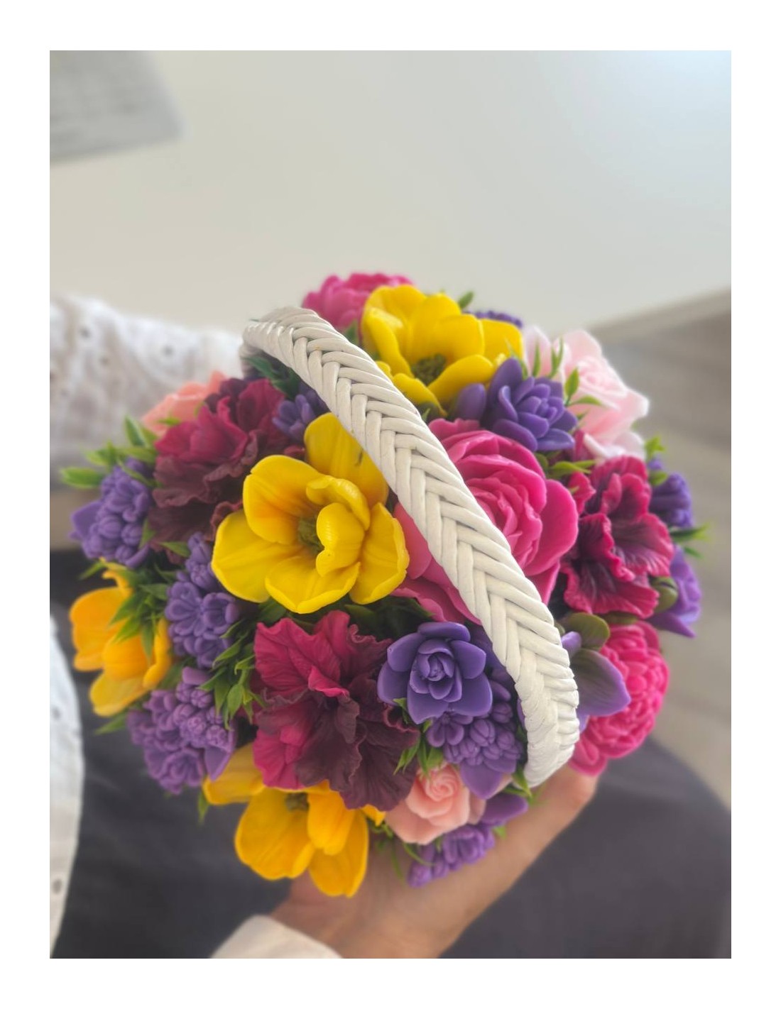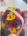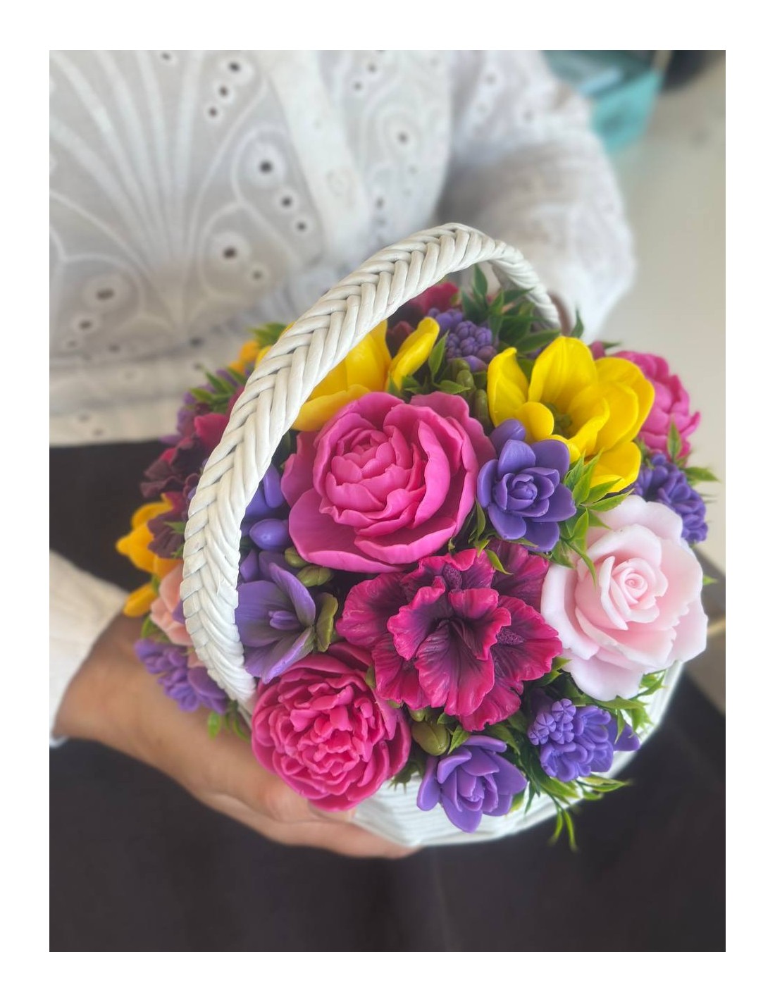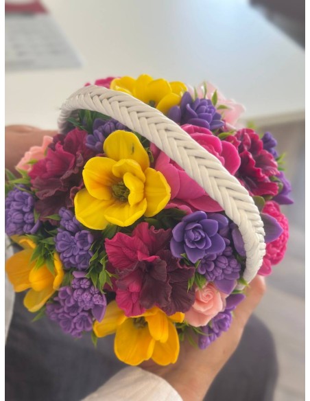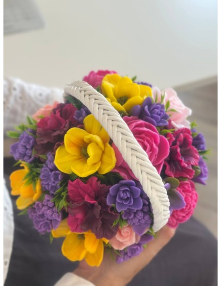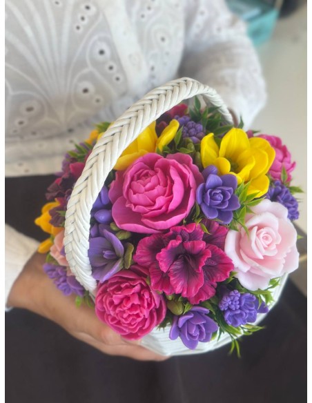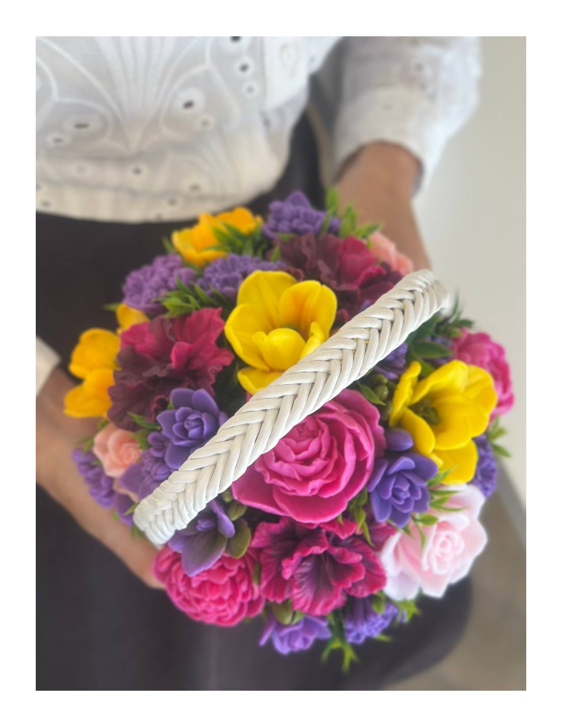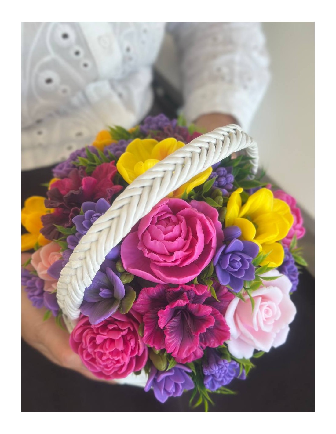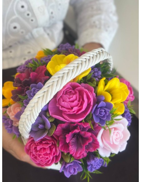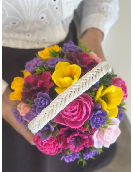 Bukiet z mydlanych kwiatów w koszyku – Kolorowa Harmonia
