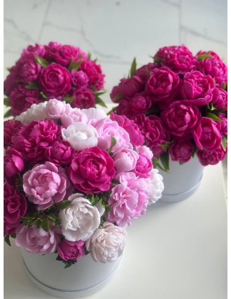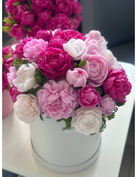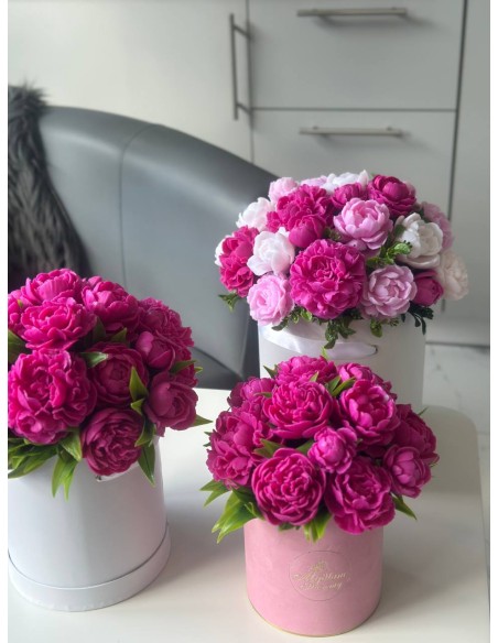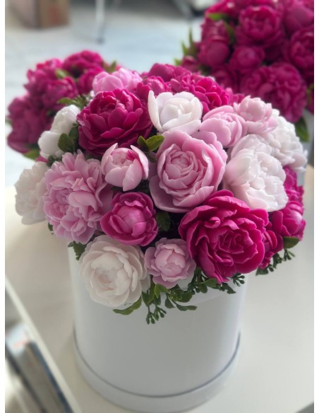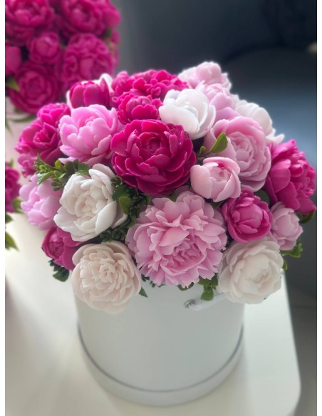 Elegancka kompozycja z mydlanych piwonii, które wyglądają jak prawdziwe kwiaty i niemal nie różnią się od świeżych. Wykonane są z glicerynowego mydła, dzięki czemu delikatnie pachną kwiatowym aromatem, długo zachowując zarówno zapach, jak i swój piękny wygląd.