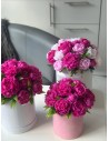 Cała kompozycja ma około 30 cm wysokości. Bukiet składa się z około 30 piwonii w różnych rozmiarach – dużych, średnich, mniejszych oraz pąków – tworząc efektowną i pełną formę.