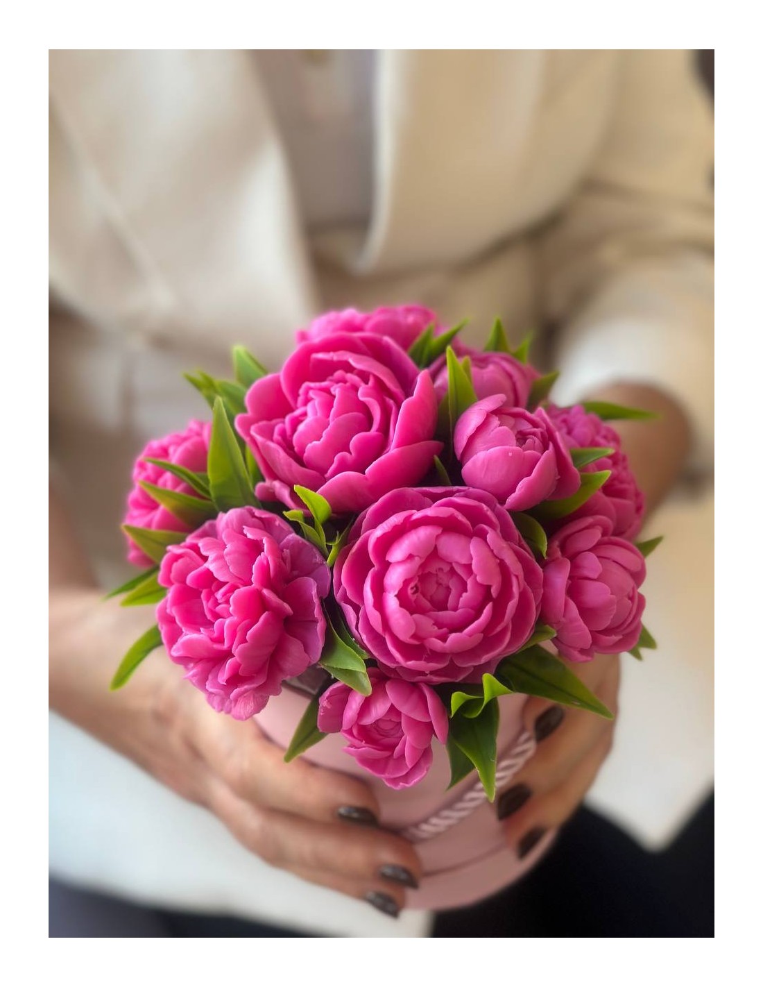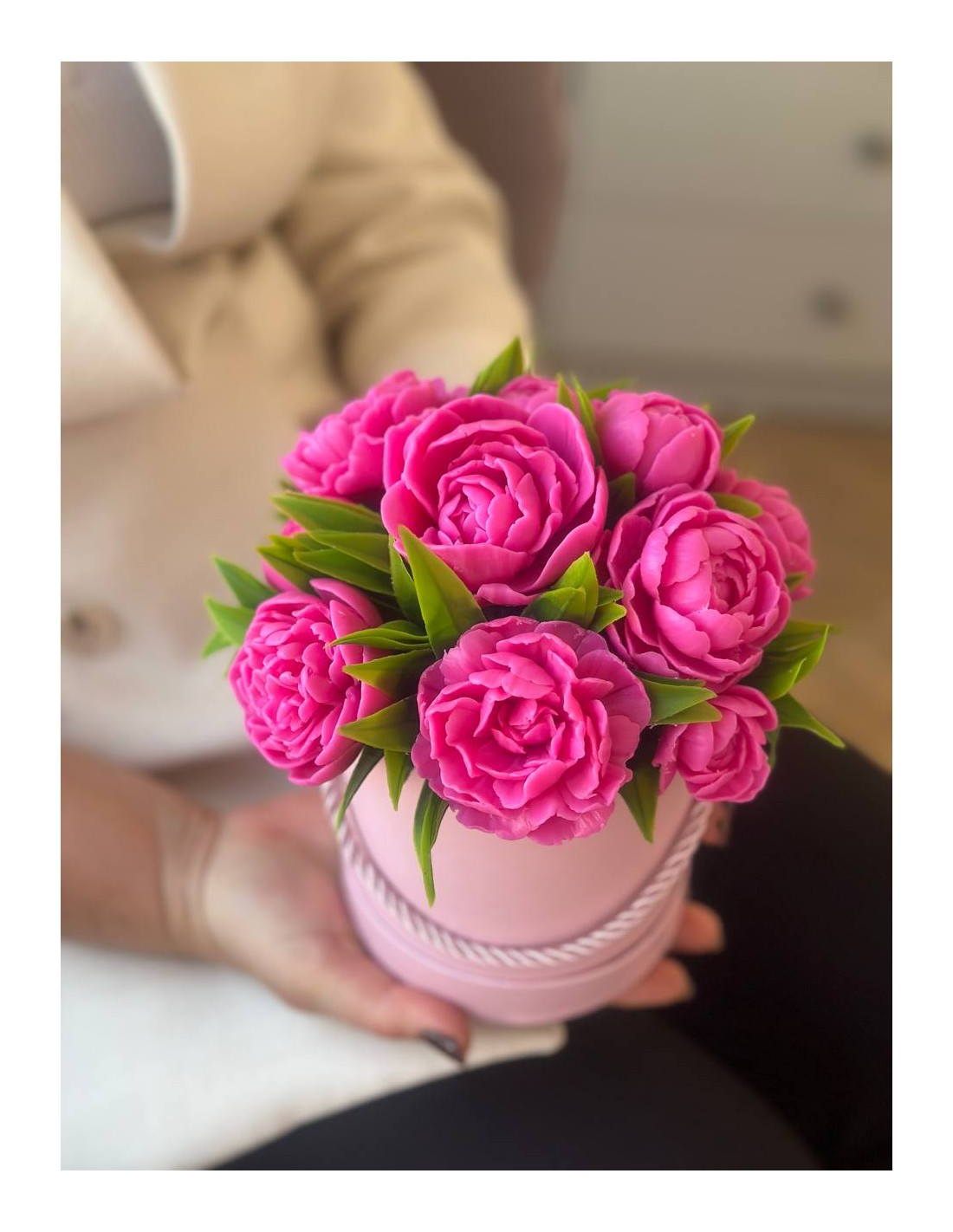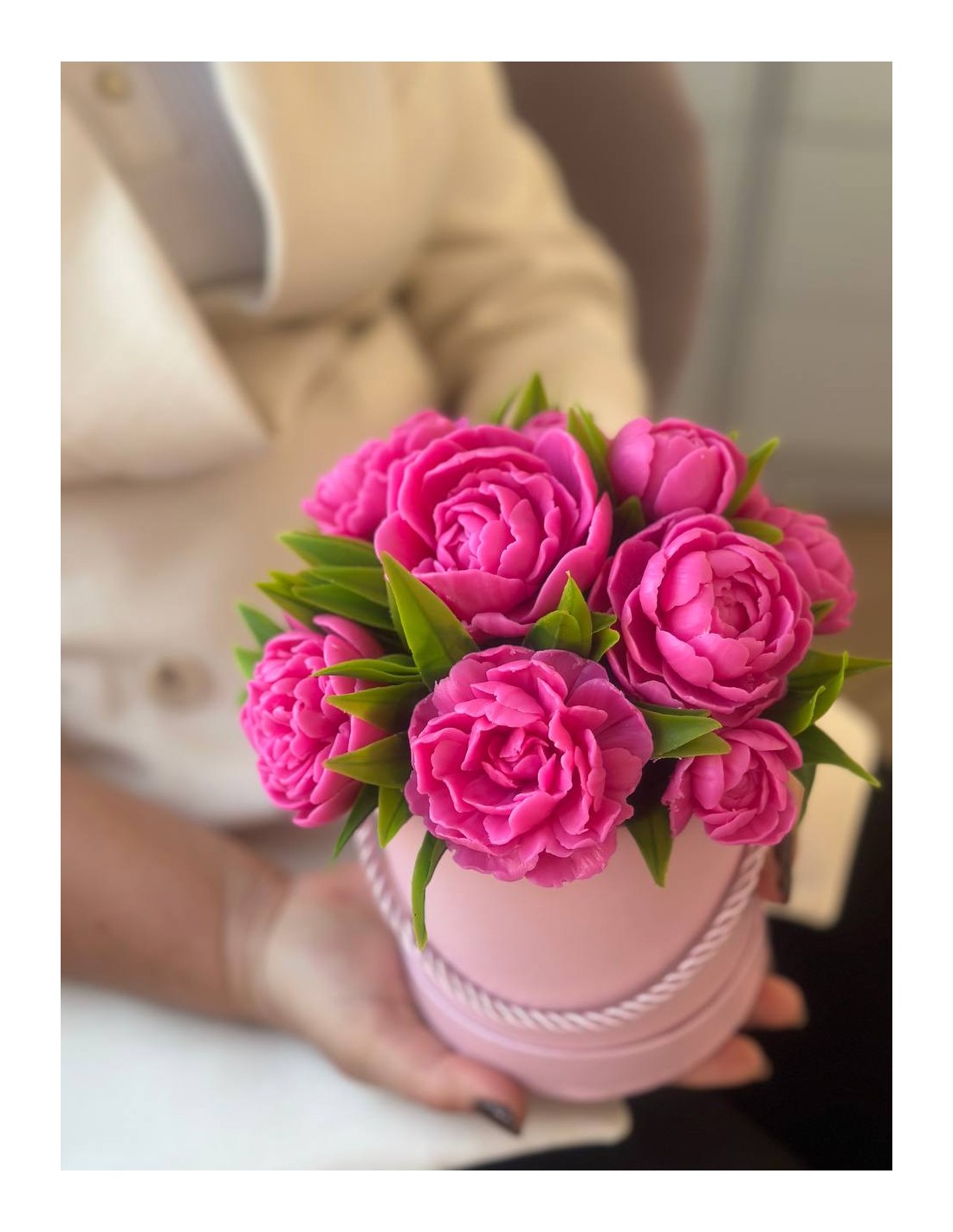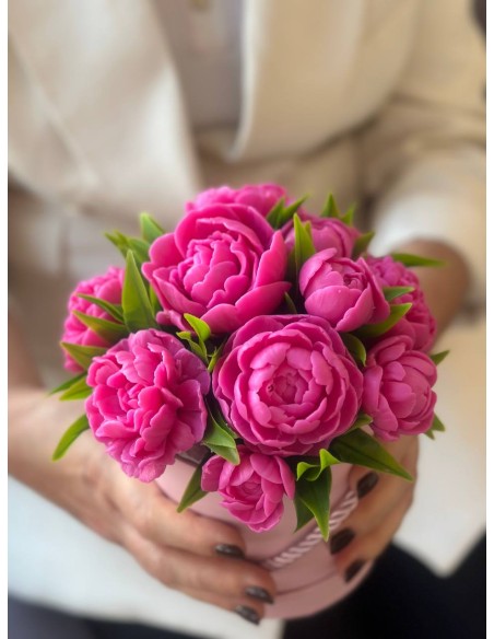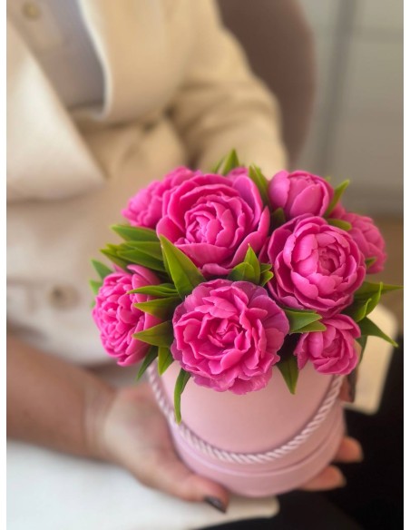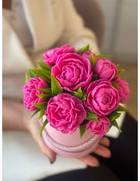 To wyjątkowy i efektowny prezent na każdą okazję – urodziny, rocznicę, ślub, chrzest, Dzień Nauczyciela, Dzień Mamy, Dzień Babci czy jako forma podziękowania. Cała kompozycja ma około 18 cm wysokości i składa się z około 11 piwonii w różnych rozmiarach – dużych, średnich, mniejszych oraz pąków – tworząc efektowną i pełną formę.
