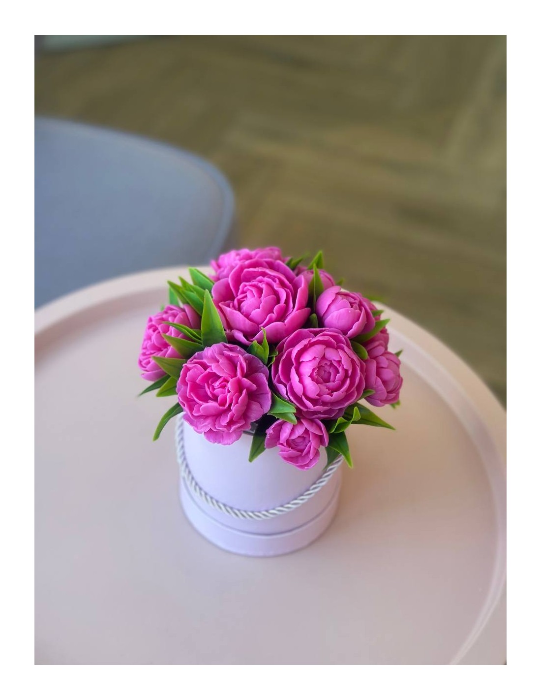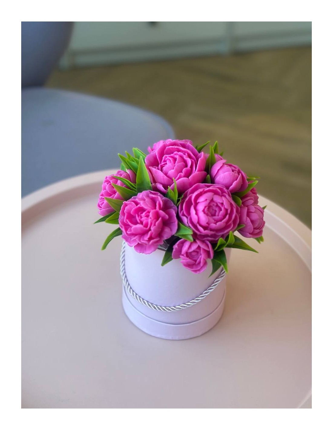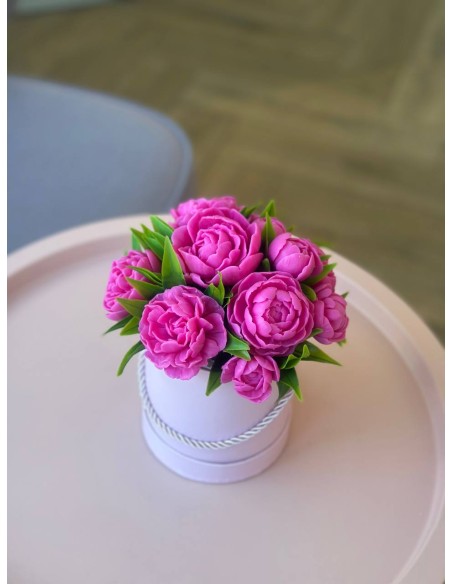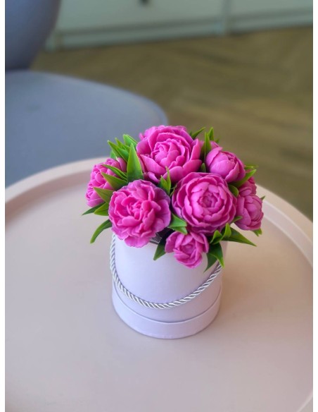 Elegancka kompozycja z mydlanych piwonii, które wyglądają jak prawdziwe kwiaty i niemal nie różnią się od świeżych. Wykonane są z glicerynowego mydła, dzięki czemu delikatnie pachną kwiatowym aromatem i przez długi czas zachowują swój piękny wygląd.