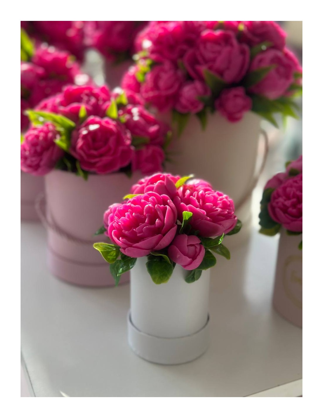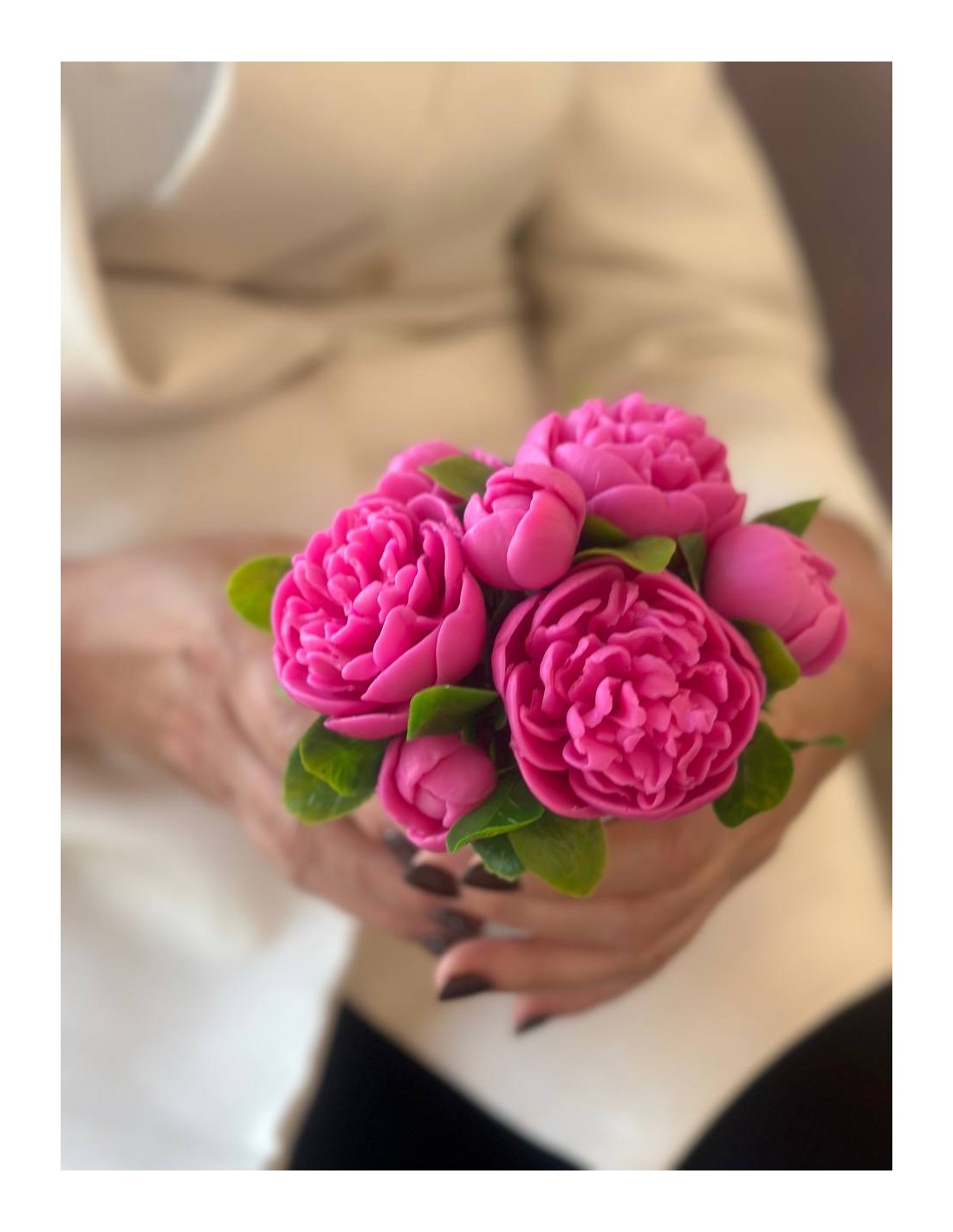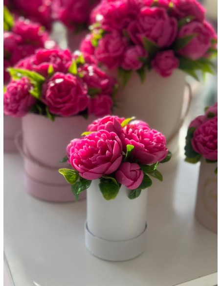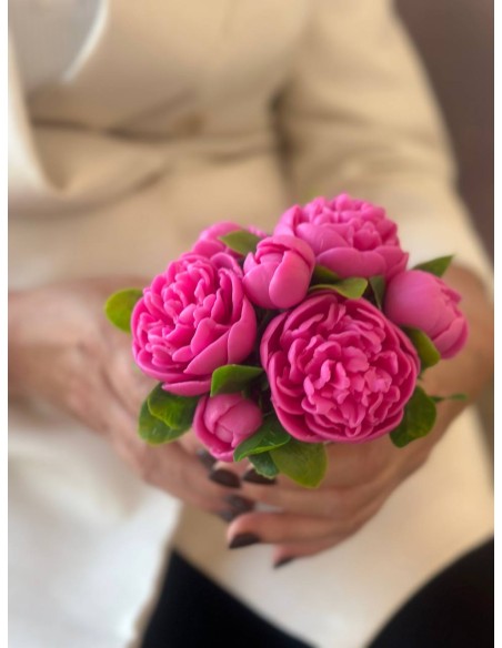 Elegancka kompozycja z mydlanych piwonii, które wyglądają jak prawdziwe kwiaty i niemal nie różnią się od świeżych. Wykonane są z glicerynowego mydła, dzięki czemu delikatnie pachną kwiatowym aromatem, długo zachowując zarówno zapach, jak i swój piękny wygląd.