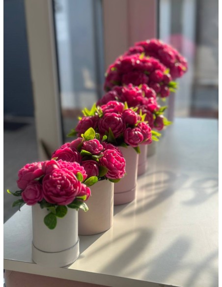 Cała kompozycja ma około 15 cm wysokości. Bukiet składa się z około 7 piwonii w różnych rozmiarach – dużych, średnich, mniejszych oraz pąków – tworząc efektowną i pełną formę.