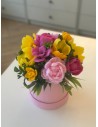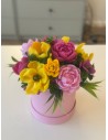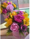 Wyjątkowa kompozycja, w której różowe piwonie spotykają się z energetycznymi, żółtymi magnoliami oraz subtelnymi dodatkami kwiatowymi. Całość tworzy bukiet pełen elegancji i świeżości, który wnosi radość i ciepło do każdego wnętrza.
