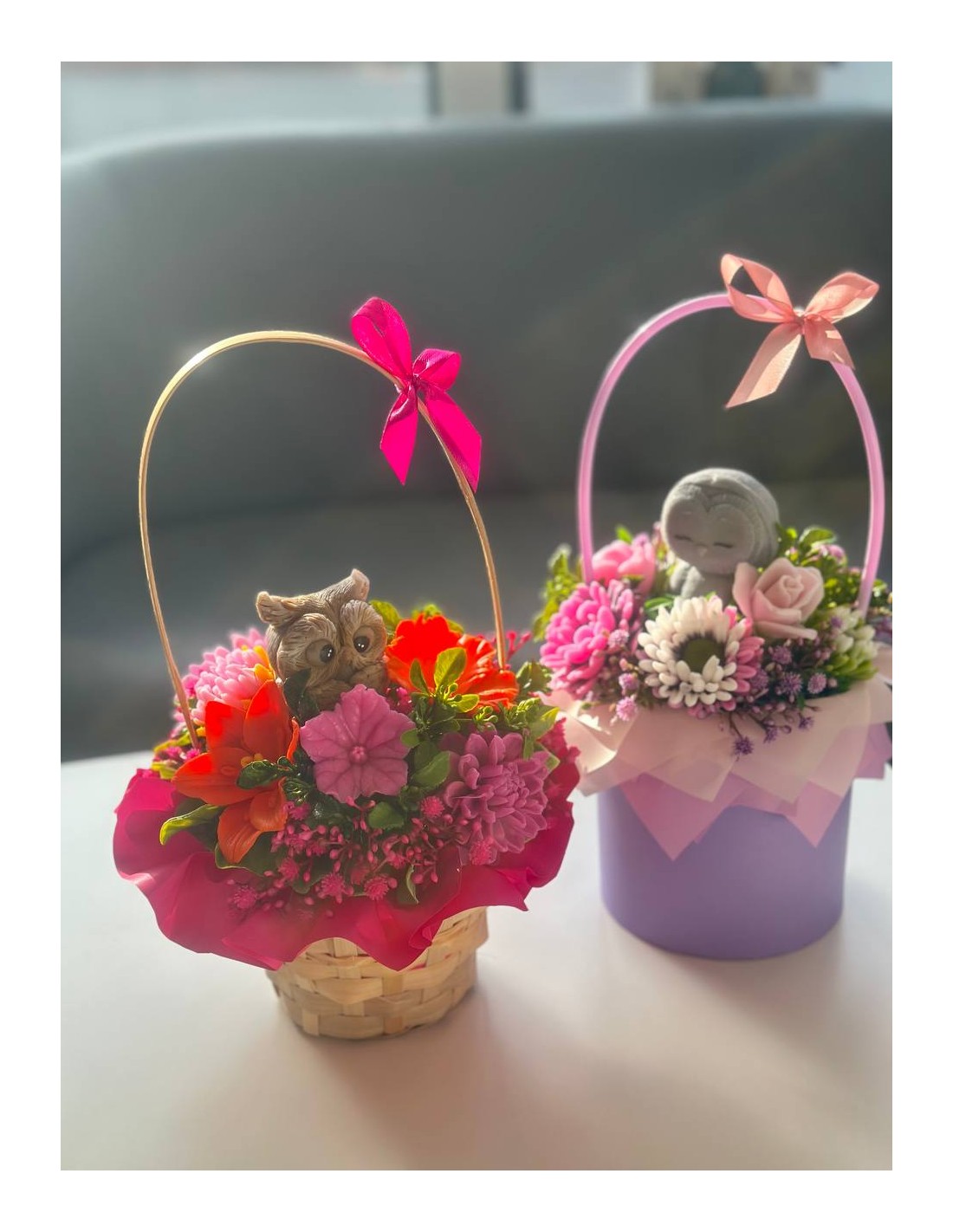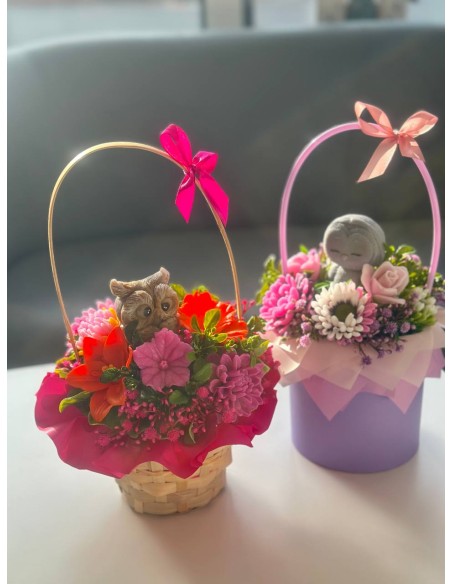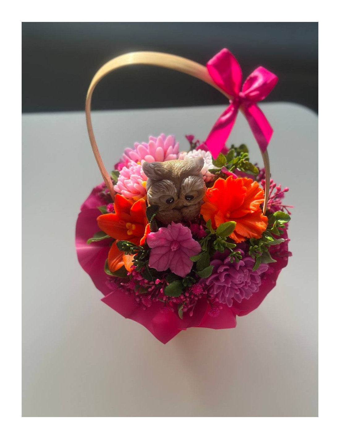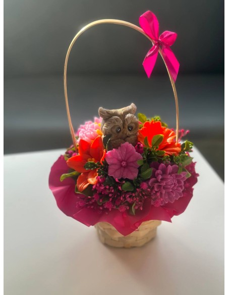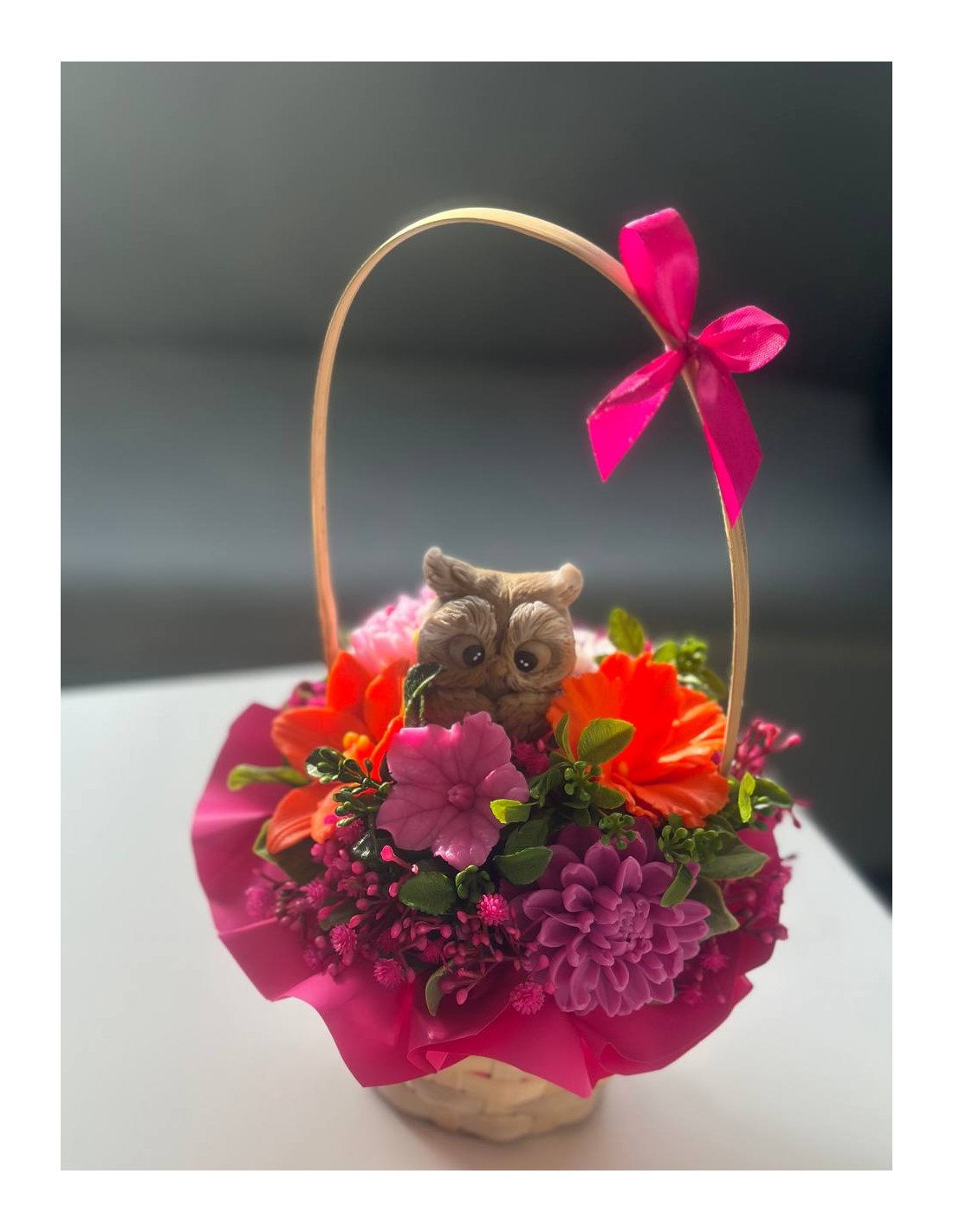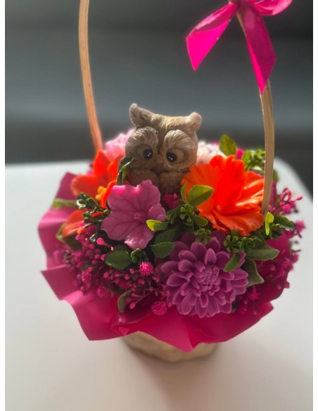 Wyjątkowa kompozycja wykonana ręcznie z mydła glicerynowego, umieszczona w ozdobnym koszyku. W środku znajduje się starannie dobrany miks kwiatów w różnorodnych, jesiennych odcieniach – od subtelnych pasteli po ciepłe barwy różu, fioletu i pomarańczy. Kwiaty roztaczają delikatny, kwiatowy zapach i przez długi czas zachowują swój urok.