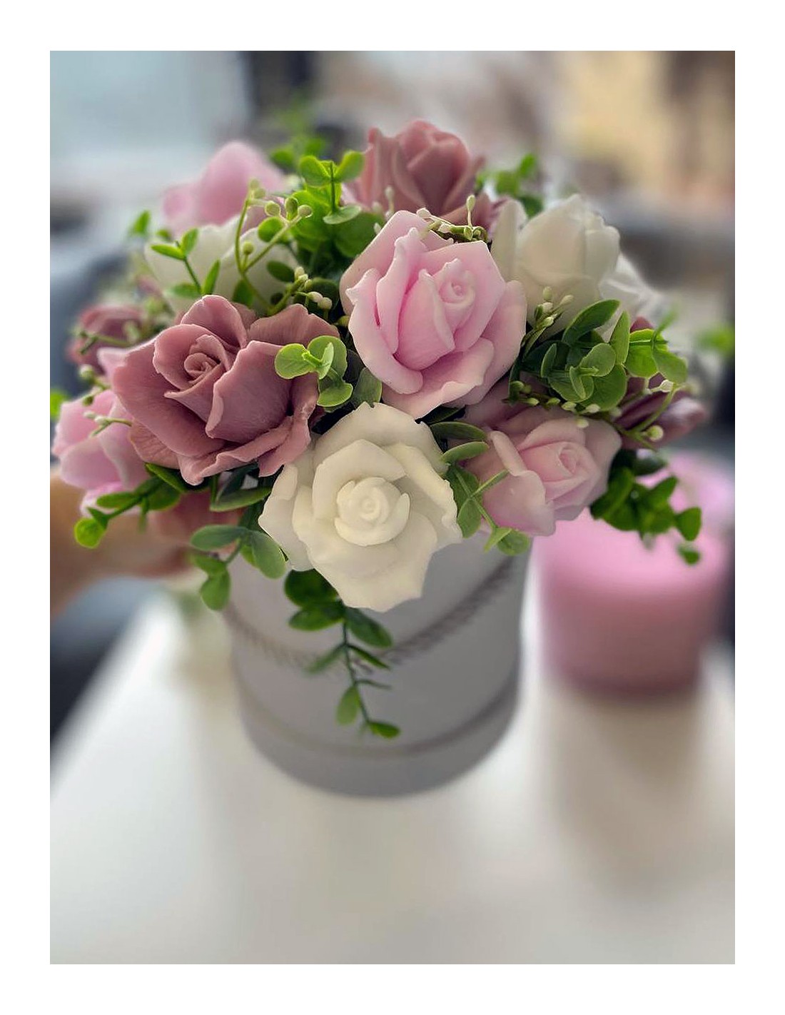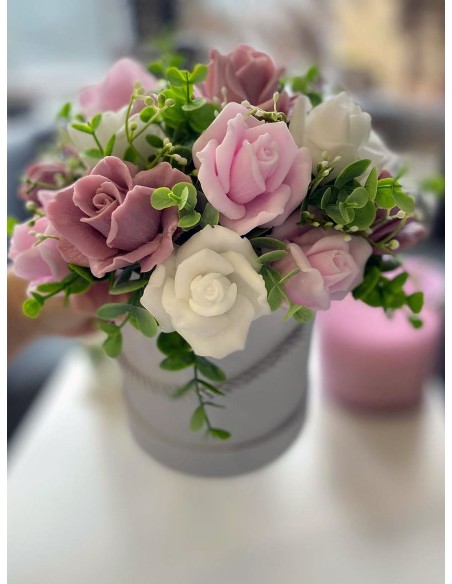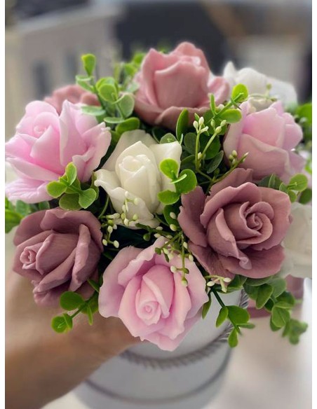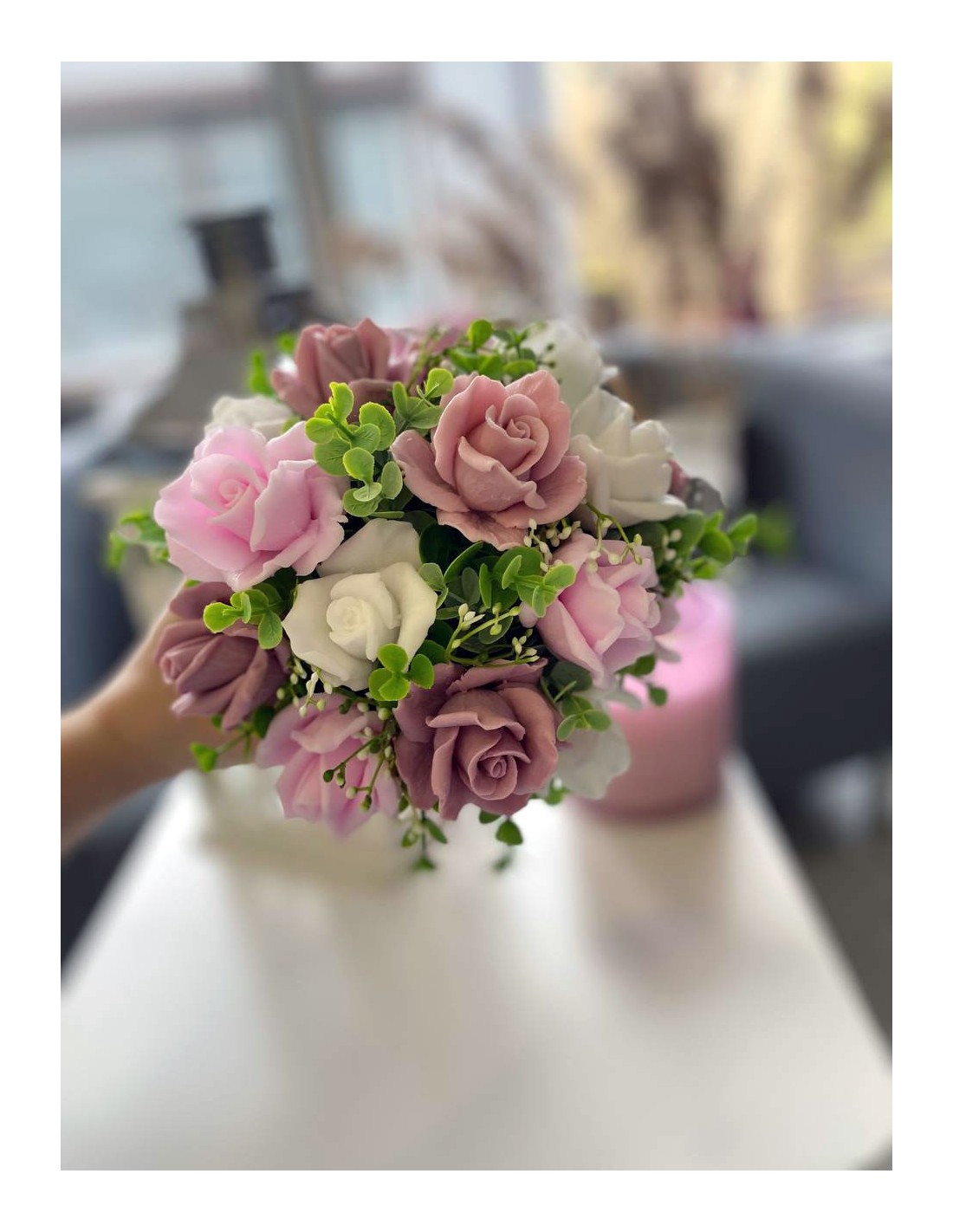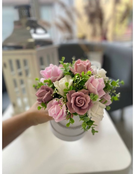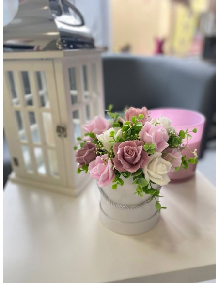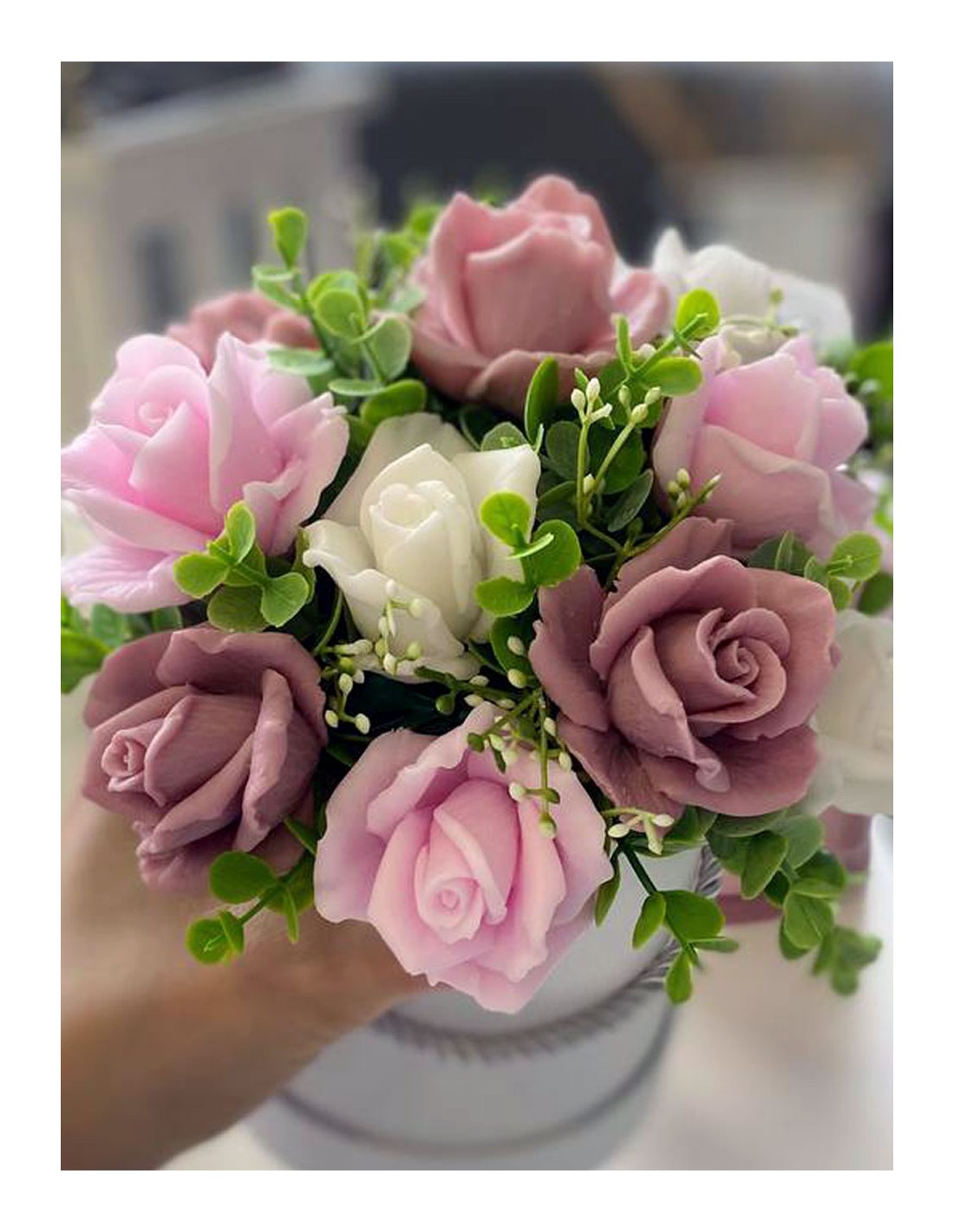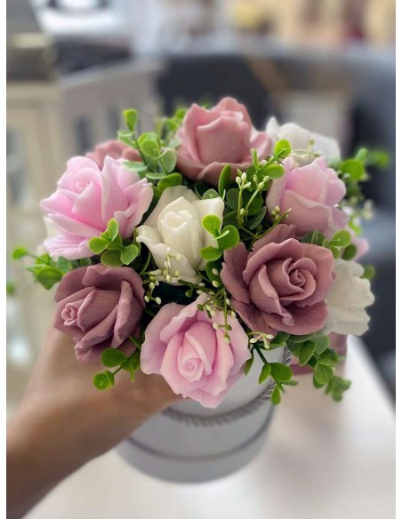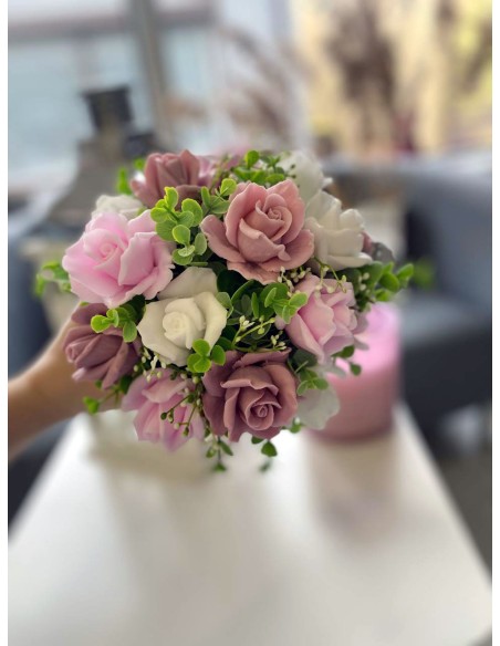 Bukiet mydlanych róż o delikatnym różanym zapachu. Umieszczony w eleganckim prezentowym opakowaniu.