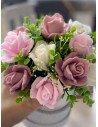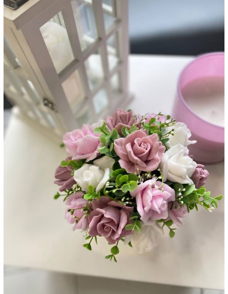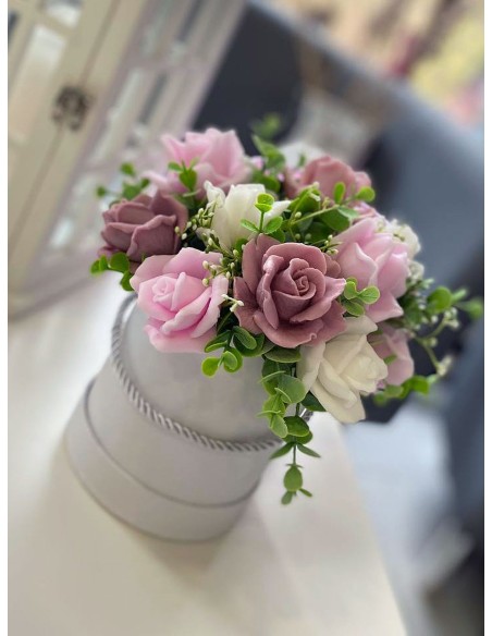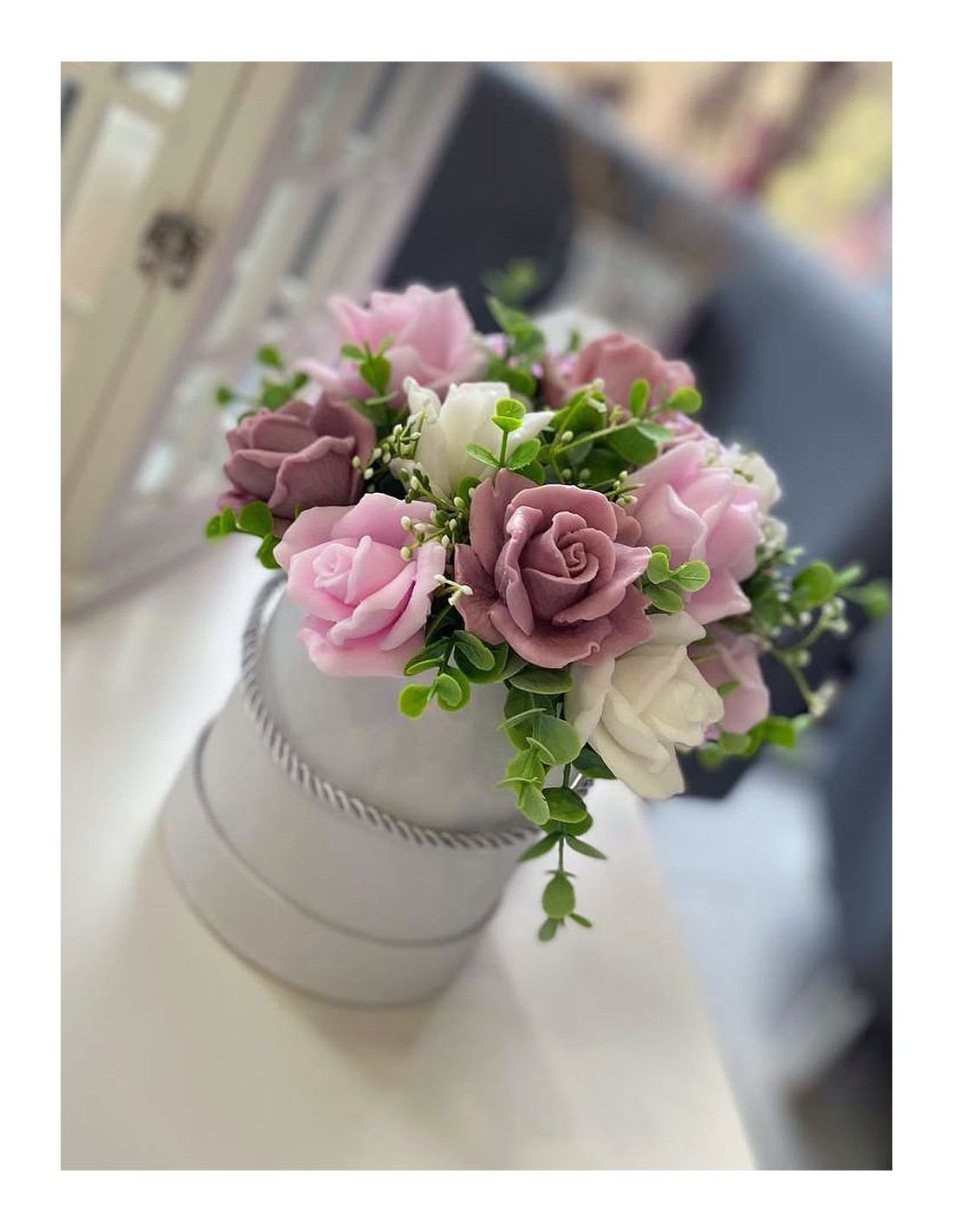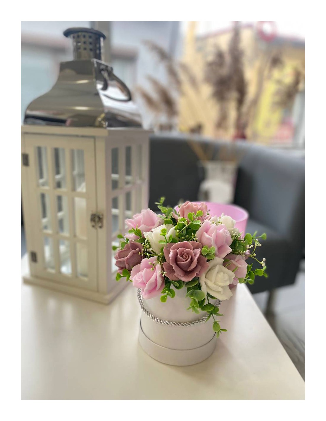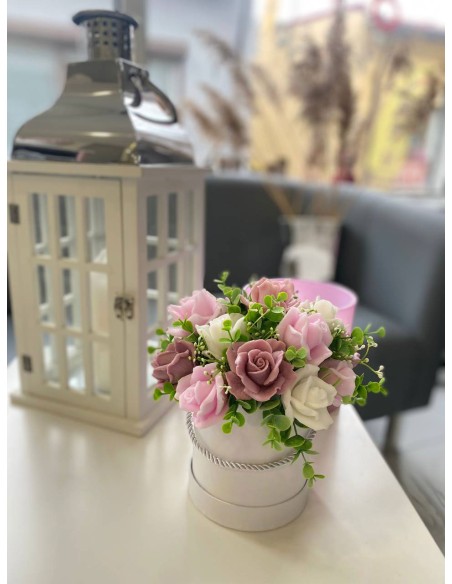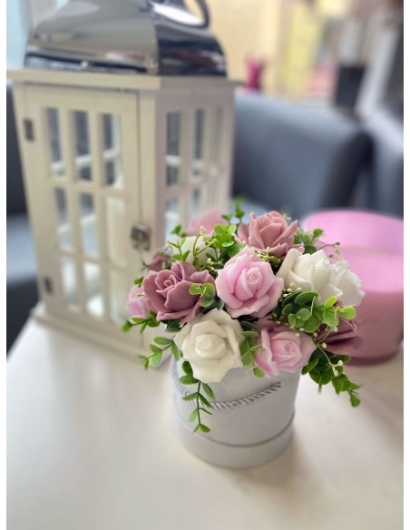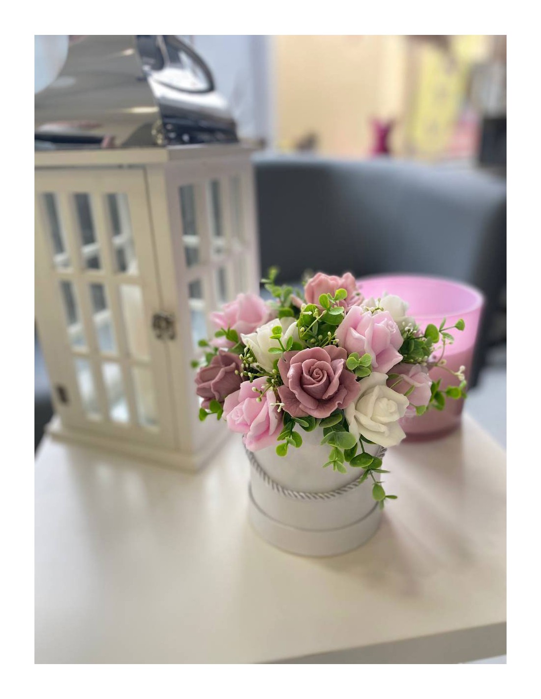 Bukiet mydlanych róż o delikatnym różanym zapachu. Umieszczony w eleganckim prezentowym opakowaniu.