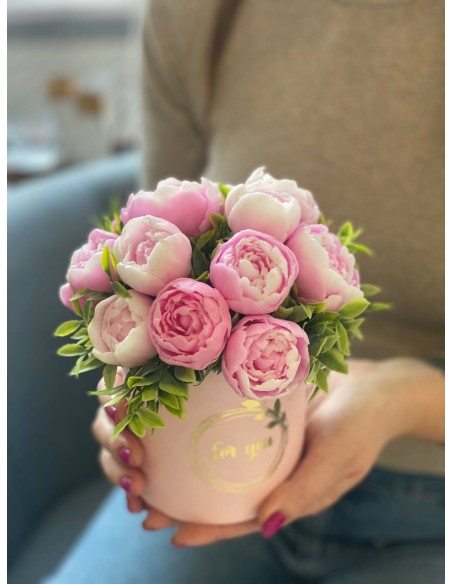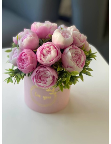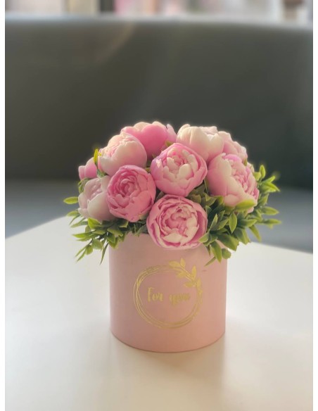 Bukiet mydlanych różowy piwonii o delikatnym zapachu piwonii, umieszczonych w eleganckim prezentowym opakowaniu.