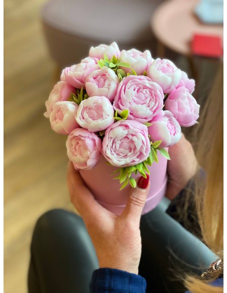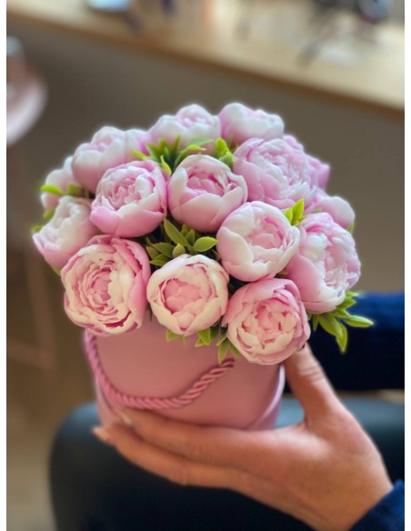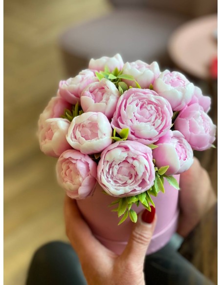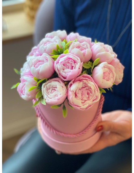 Bukiet z 17 mydlanych kwiatów piwonii o zapachu piwonii, umieszczony w eleganckim prezentowym opakowaniu.
